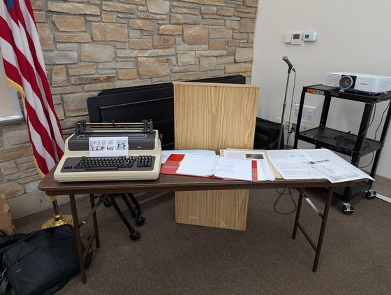 My poor unhappy printing terminal on side table with various Ephemera.