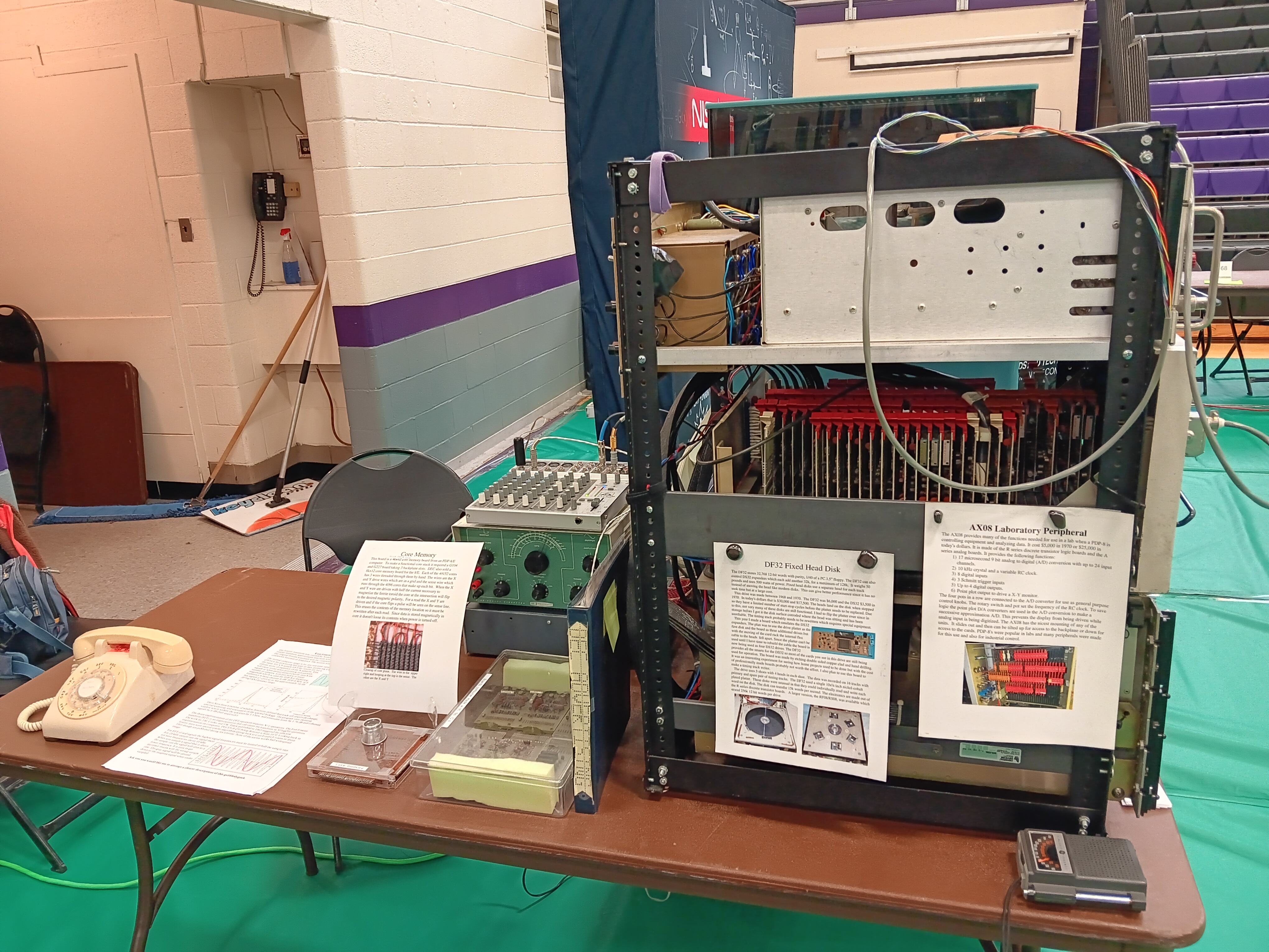 Core memory, boards, and advertising on display. Also information on the peripherals. Behind rack is a power supply for the phone, tone generator, and mixer to set correct levels for AX08 and speaker. Also had an AM radio so I could demonstrate music generation from the radio frequency interference of the PDP-8.